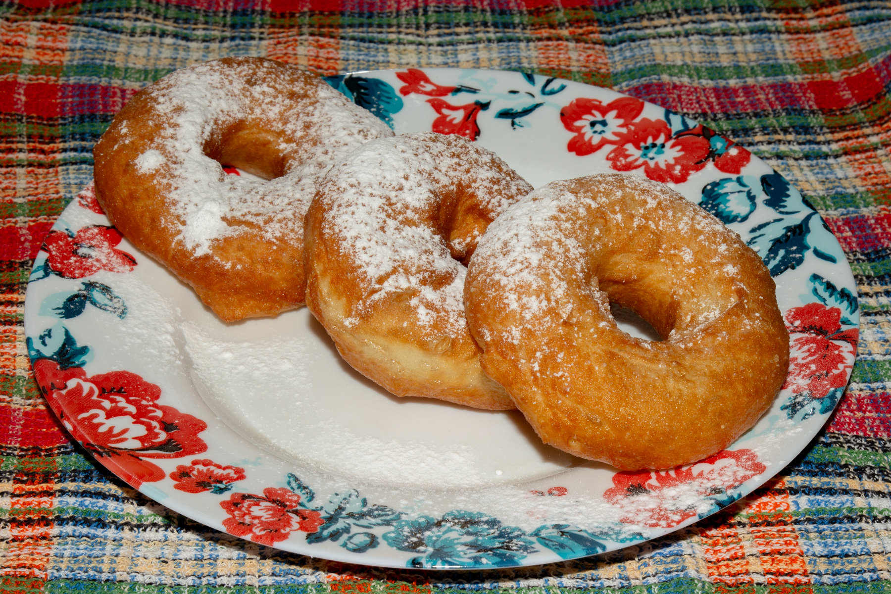 Готовые пончики обсыпать сахарной пудрой с корицей.