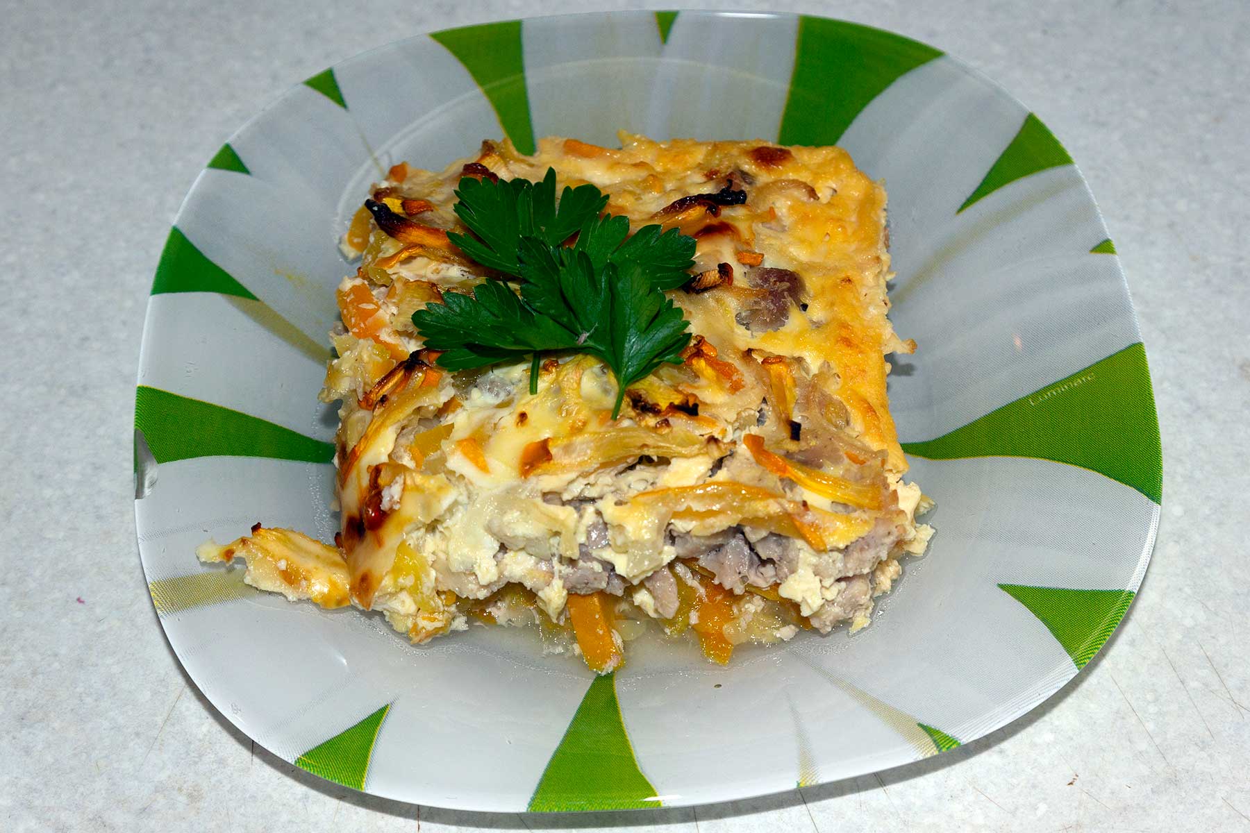 5. В фарш влить 0,5 стакана молока, посолить, поперчить, хорошо вымесить. На дно огнеупорной формы уложить половину овощей, на овощи - мясной фарш, сверху - оставшиеся овощи.