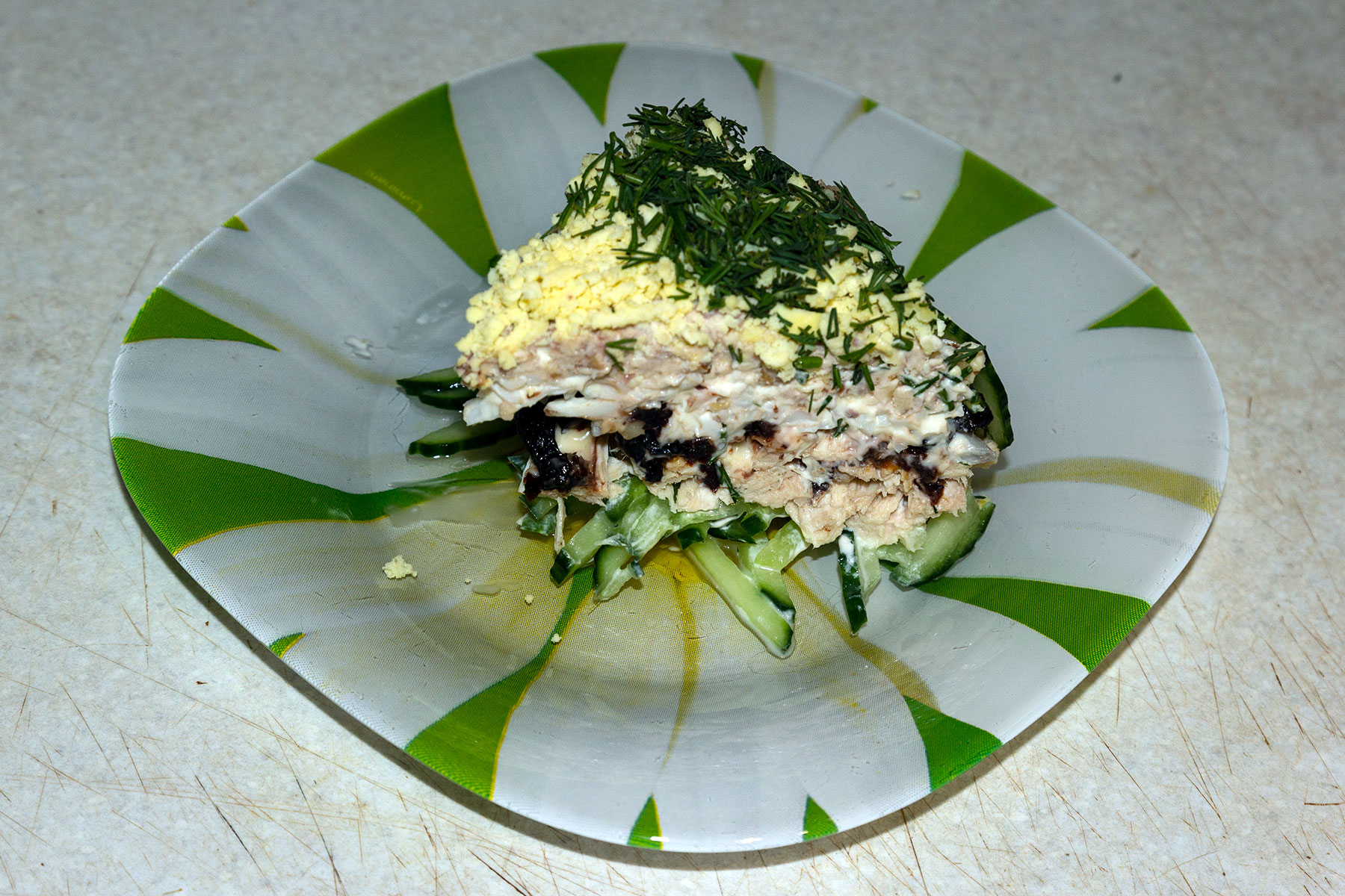 Орехи порубите. На дно круглого плоского салатника уложите огурцы, полейте тонким слоем майонеза и уложите слоями нарезанные курицу, чернослив, яичные белки, орехи, каждый раз прослаивая майонезом.