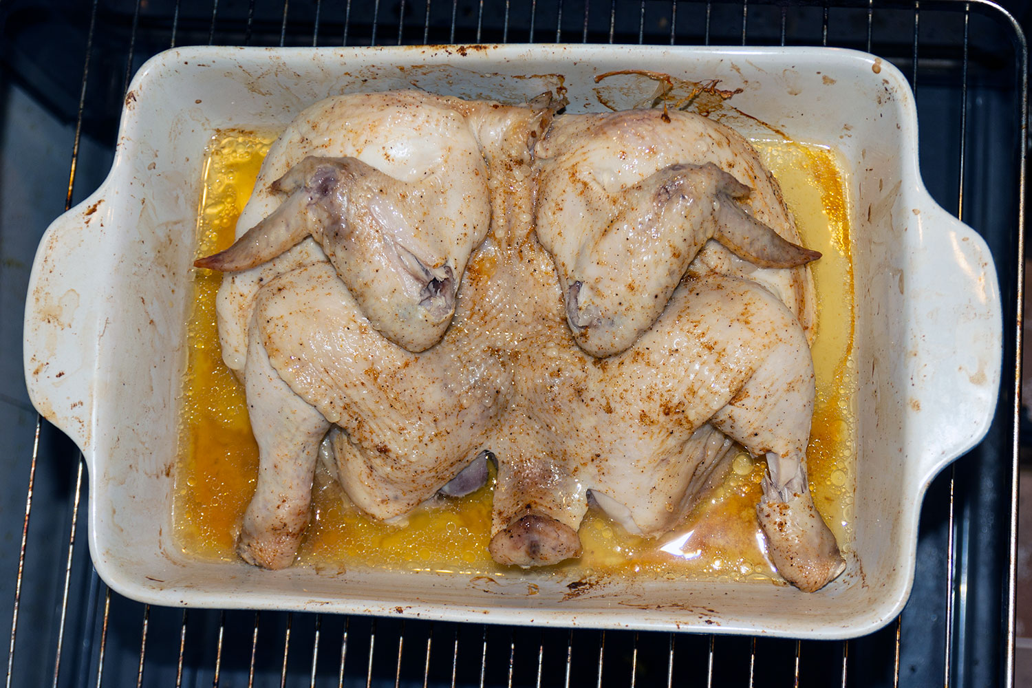 Тушку курицы выпотрошите, промойте, обсушите, разрежьте спереди и распластайте так, чтобы ребра касались смазанной маслом жаровни. Уксус разведите в 150 мл воды, смочите им курицу, натрите ее измельченным чесноком, посолите, поперчите, оставьте на 12 часов в прохладном месте.