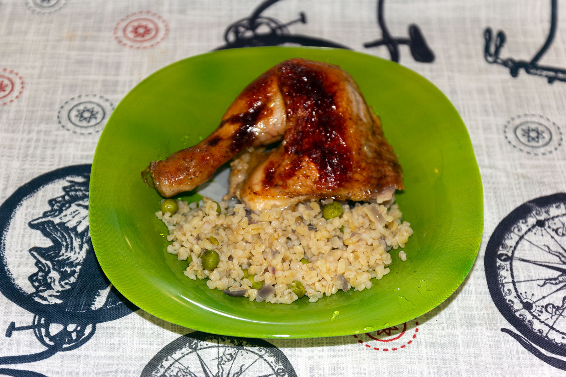 Жаровню с курицей накройте фольгой и запекайте 1,5 часа в горячей духовке при 150-160 С. Фольгу снимите.