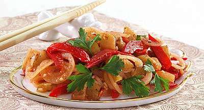 Баклажаны промойте, очистите, нарежьте ломтиками, отварите в течение 10 минут. Откиньте на дуршлаг и дайте воде стечь. Сладкий перец промойте, очистите и нашинкуйте соломкой. Лук нарежьте колечками. Чеснок мелко порубите. Подготовленные продукты соедините, заправьте маслом, уксусом, сахаром, солью, кориандром и молотым перцем, перемешайте.