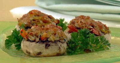 У шампиньонов срежьте ножки. Лук и ножки шампиньонов мелко порубите, соедините, добавьте овсяные хлопья и обжарьте смесь на оливковом масле. Помидоры и перец нарежьте ломтиками, соедините с луковой смесью, добавьте зелень, посолите, поперчите и перемешайте. Грибные шляпки нафаршируйте приготовленной начинкой, посыпьте сыром. Запекайте шляпки 15 минут при 200 С.