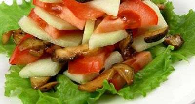 Грибы нарежьте ломтиками, обжарьте на масле, охладите, соедините с яблоками и помидорами, нарезанными ломтиками.