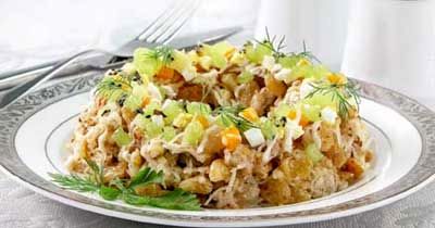 Очищенные от кожицы киви или крыжовник мелко нарежьте. Изюм распарьте, затем промойте и обсушите. Яйца мелко порубите. Морковь нарежьте мелкими кубиками. Сыр натрите на терке. Чеснок пропустите через пресс. Сыр смешайте с изюмом, орехами, чесноком и половиной нормы майонеза, поперчите. Массу выложите в салатник кольцом, посыпьте яйцами, морковью, полейте оставшимся майонезом, посыпьте киви или крыжовником. Оформите зеленью петрушки.