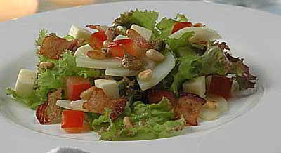 Картофель отварите в "мундире", очистите и нарежьте ломтиками. Кедровые орешки обжарьте до золотистого цвета. Помидор и брынзу нарежьте кубиками. Листья салата крупно нарвите. Уксус соедините с горчицей, солью и перцем, тонкой струйкой влейте смесь в растительное масло, взбейте. Приготовленный соус перемешайте с картофелем. Соедините картофель с листьями салата, брынзой и помидорами.