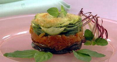 Кабачки и баклажаны нарежьте ломтиками толщиной 5 мм. Ломтики баклажанов посолите, полейте уксусом, оставьте на 30 минут, затем промойте. Лук нарежьте кольцами и спассеруйте на масле с томатом. В форму, смазанную маслом, выложите слоями, чередуя, баклажаны, лук и кабачки, посолите, поперчите, посыпьте сухарями, сбрызните маслом и запекайте 20-30 минут при 180 С.