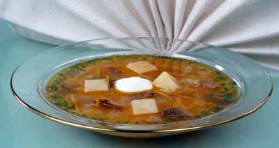 Грибы замочите в холодной воде на 3 часа, затем промойте. Настой процедите, сварите в нем грибы. Затем нашинкуйте их соломкой, обжарьте на части масла, отвар охладите. Капусту нарежьте шашками, картофель - крупными кубиками. Положите овощи в кипящую воду, добавьте нашинкованные соломкой коренья и варите до полуготовности. Томат разведите небольшим количеством воды, обжарьте на масле с нарезанным кубиками луком, добавьте при помешивании муку, прогрейте, смесь охладите и разведите грибным отваром. Добавьте в суп грибы, перец горошком, варите 10 минут, затем добавьте томатную смесь, лавровый лист, посолите и варите еще 5 минут.