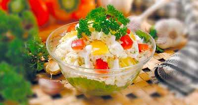 Сыр натирают на крупной терке. Стручковый перец нарезают мелкими кубиками. Сыр, мелко рубленный чеснок, стручковый перец, майонез и молотый перец перемешивают и укладывают горкой в салатник или формуют шариками и раскладывают на листья зелёного салата.