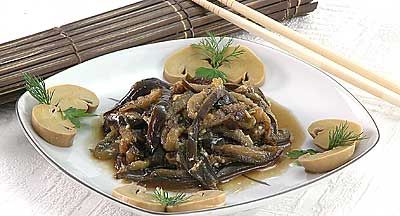 Баклажаны промойте, удалите плодоножки, разрежьте вдоль пополам, удалив семена, и сварите до готовности, затем откиньте на дуршлаг, охладите и нарежьте соломкой. Заправьте маслом, соевым соусом, мелко нарезанным чесноком и солью. Подготовленные баклажаны выложите на тарелку, оформите грибами и зеленью.