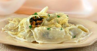 Тесто раскатайте в 2 одинаковых тонких пласта. На один пласт теста разложите по 1 чайной ложке начинки на расстоянии 3-5 см друг от друга. Накройте вторым пластом, плотно прижмите пальцами пласты вокруг начинки, затем разрежьте их по линиям прижима на квадраты. Варите равиоли в кипящей подсоленной воде 5-7 минут. Выньте шумовкой, выложите на блюдо, заправьте маслом, посыпьте сыром и зеленью.