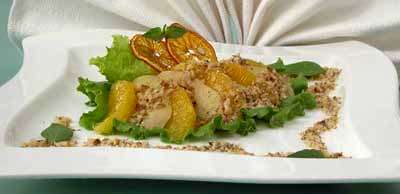 При подаче выложите на листья салата и посыпьте рублеными орехами.