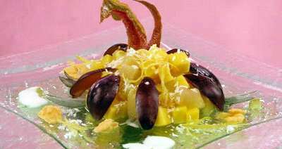 Очищенные фрукты нарежьте кубиками, сливы - дольками. Сахар с водой доведите до кипения, положите мелко нарезанный корень имбиря и варите до загустения, влейте сок и охладите. Фрукты уложите в салатник, залейте процеженным сиропом, посыпьте цедрой, кокосовой стружкой. Отдельно подайте йогурт и кукурузные хлопья.
