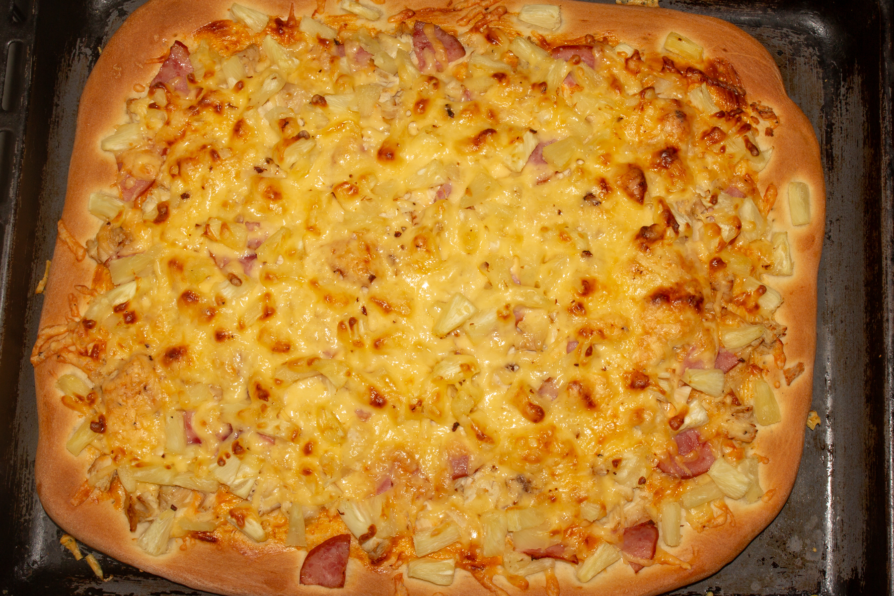 Замесить из указанных ингредиентов тесто и поставить его на 20 минут в холодильник. Раскатать ровным слоем толщиной 6 мм и выложить на противень. Раскатать из остатков этого теста жгутик, сделать бортик и смазать его желтком. Выложить начинку из мелко нарезанных кусочков колбасы и сосисок, кукурузы и ломтиков ананаса, крупных ломтиков помидоров. Посыпать тертым сыром.