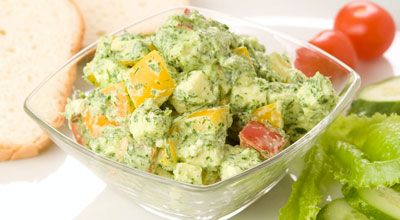 У перца удалите семена и плодоножку. Брынзу и перец нарежьте кубиками. Зелень и чеснок измельчите блендером, смешайте со сметаной, брынзой и перцем. Посолите, поперчите и перемешайте. Подавайте со свежими огурцами и помидорами.