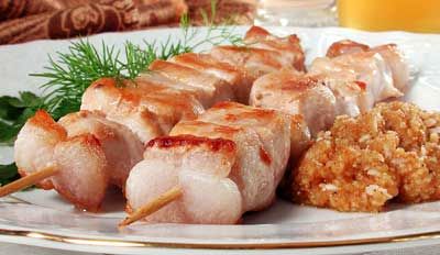 Филе индейки и шпик нарежьте небольшими кусочками. Лук очистите, одну луковицу мелко нарежьте, вторую натрите на мелкой терке. Сливочное масло растопите в 100 мл кипящей воды, перемешайте, остудите. Добавьте цедру, мелко нарезанную луковицу, кинзу, соевый соус. Взбейте миксером смесь, замаринуйте в ней на 2 часа кусочки филе и сала. Затем наденьте их на шампуры и обжарьте по 3-4 минуты с каждой стороны.