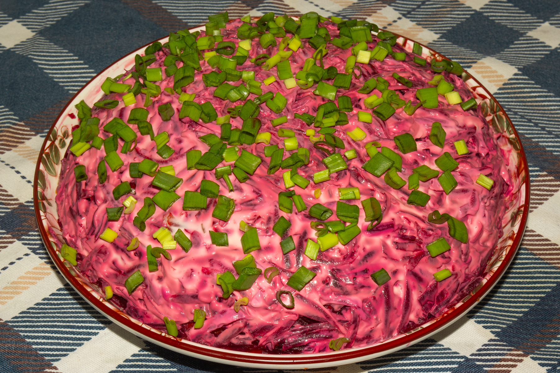 Селедку почистить, отделить мякоть от костей, порезать мелкими кубиками. Овощи и яйца сварить, почистить, протереть на крупной терке или порезать мелко кубиками. Лук мелко порезать и ошпарить кипятком. В глубокую тарелку положить слоями картофель, селедку, лук, яйцо, морковь, свеклу, майонез. Сверху положить еще раз слои овощей и яиц в том же порядке. Сверху положить больше свеклы и майонеза. Оставить в холодильнике на 5 часов.