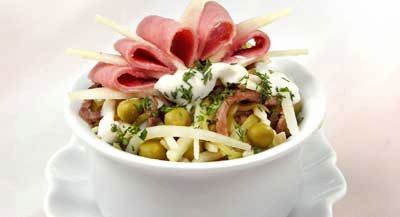 Телятину, очищенные огурец, картофель и яблоко нарежьте соломкой, соедините с зеленым горошком и заправьте половиной нормы майонеза. Салат выложите горкой в салатник. Оформите тонкими ломтиками ветчины, яблока, полейте оставшимся майонезом и посыпьте мелко нарезанной зеленью.