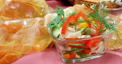 Уложите овощи и грибы слоями в фужер или салатник, полейте соусом, оформите зеленью.