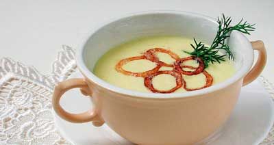 Растопите масло, обжарьте нарезанный лук до размягчения, оставьте кольца лука для оформления. Добавьте бульон, нарезанный картофель, 2-3 чайные ложки специй, паприку и 0,5-1 столовую ложку томатного пюре. Варите на слабом огне 45 минут. Протрите и снова разогрейте. Добавьте сливки в горячий суп, подогрейте. Оформите поджаренными кольцами лука.