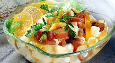 Сыр нарезают кубиками, оставив немного для посыпки. Яблоки очищают от кожицы и сердцевинок и нарезают кубиками. Шампиньоны нарезают соломкой и жарят в растительном масле. Апельсин очищают от кожуры и делят на дольки. Перец нарезают соломкой или кольцами и соединяют с дольками апельсина. Соединяют все входящие в состав соуса компоненты и хорошо взбивают.