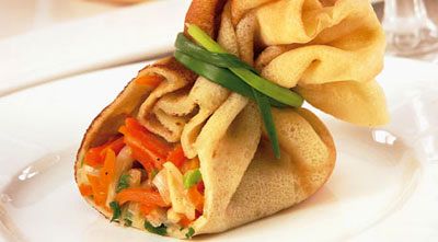 Из муки, растительного масла, молока, соли и сахара замесите тесто и выдержите 30 минут. Жарьте блинчики без жира. Репчатый лук порубите, остальные овощи нарежьте соломкой. Для начинки нарезанные овощи и лук залейте овощным отваром, посолите, поперчите, варите 5 минут, затем введите молоко и пассерованную без жира муку, прогрейте.