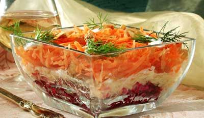 Очищенную морковь натрите на крупной тёрке, перемешайте с кишмишем и 1 чайной ложкой майонеза. Сыр натрите на крупной тёрке, чеснок измельчите. Сыр и чеснок перемешайте. Свёклу запеките в духовке до готовности. Охладите, очистите, натрите на крупной тёрке. Слегка обжаренные грецкие орехи мелко нарубите и перемешайте со свёклой. В салатники из прозрачного стекла выложите слоями свеклу с орехами, сыр с чесноком и морковь с изюмом, смазывая майонезом каждый слой, кроме верхнего. Оформите веточками укропа.