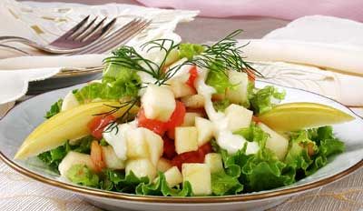 Для соуса помидоры ошпарьте, очистите от кожицы, разрежьте на 4 части, удалите семена, мелко нашинкуйте, залейте майонезом или сметаной, перемешайте. На блюдо, выстланное листьями салата, положите подготовленную фруктово-овощную смесь, заправьте соусом и оформите зеленью.