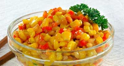 Ядра кедровых орешков обжарить с 1 столовой ложкой масла до золотистого цвета. Вынуть, дать маслу стечь. Морковь промыть, очистить и нарезать мелкими кубиками. Обжарить в оставшемся масле в течение 2-3 минут, добавить кукурузу, соль, 2 столовые ложки воды и довести до кипения. Затем положить обжаренные орешки и влить крахмал, разведенный небольшим количеством воды. Тушить до загустения соуса.