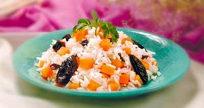 Чернослив промывают, заливают холодной водой и варят с сахаром до готовности. Охлаждают и вынимают косточки. Отвар процеживают. Морковь очищают от кожицы, нарезают кубиками и пассеруют на масле. Рис перебирают, моют холодной водой. В отвар от чернослива закладывают подготовленный рис, отвара берут в 2 раза больше, чем риса, варят 10 минут, добавляют пассерованную морковь, соль и варят до готовности. Часть чернослива оставляют целиком для оформления, а часть нарезают кубиками и смешивают с морковью и рисом.