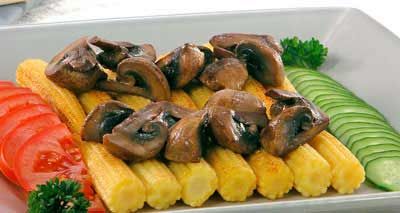 Грибы и кукурузу, отцедив заливку, промыть холодной водой. В разогретом до 160 С масле обжарить грибы и кукурузу, добавить черемшу, имбирь. Обжаривать, постоянно помешивая, ещё 2 минуты. Влить 2 стакана воды, приправить сахаром и солью, довести до кипения и тушить на слабом огне в течение 5-8 минут.