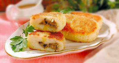 Грибы перебирают, моют и замачивают в холодной воде на 3-4 часа. Воду сцеживают, грибы промывают ещё раз, соединяют с водой, в которой они замачивались, и варят до готовности без соли. Готовые грибы нарезают мелкими кубиками. Лук очищают, мелко нарезают и пассеруют на масле, добавляют нарезанные грибы и пассеруют всё вместе. Грибной фарш заправляют солью и перцем. чищенный картофель заливают горячей водой, солят и варят до готовности. Воду сливают, картофель обсушивают и протирают горячим. В протертый картофель добавляют яйцо, хорошо промешивают и формуют в виде лепешки. На середину лепешки укладывают грибной фарш, края соединяют и придают форму кирпичика, который затем панируют в сухарях. Зразы жарят на раскаленной сковороде при 170 С до образования румяной корочки.