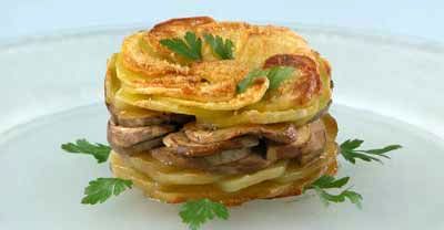 Форму для запекания натрите разрезанным зубчиком чеснока и смажьте маслом. Уложите в форму нарезанный тонкими кружочками картофель, на него - слой нарезанных ломтиками грибов, посолите, полейте маслом. Затем уложите ещё один слой картофеля, полейте его маслом и посыпьте панировочными сухарями. Запекайте в духовке 40-50 минут при 180 С.