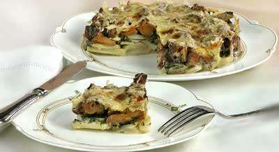 Запекайте при 230 С 20 минут. Лисички жарьте 1-2 минуты на оливковом масле. Добавьте оставшийся шалфей, чеснок и мелко нарезанный розмарин, перемешайте и жарьте ещё 1-2 минуты. Выложите грибы поверх картофеля, полейте оставшимися сливками, посыпьте сыром и сбрызните растопленным сливочным маслом. Запекайте ещё 15 минут, до образования румяной корочки. При подаче нарежьте запеканку на порции и выложите на блюдо.