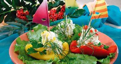 Взбейте сыр с добавлением лимонного сока, молотого перца, добавьте часть укропа и каперсов, перемешайте. Разрежьте стручки перца вдоль, удалите семена, промойте и обсушите, затем нарежьте ромбиками, напоминающими лодочки. Обрезки перца нарежьте мелкими кубиками. Разложите сырную массу в виде горки на "лодочки", оформите кубиками перца, каперсами и зеленью.