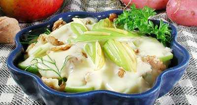 Картофель отваривают и нарезают ломтиками. Добавляют нарезанное ломтиками очищенное яблоко и мелко рубленые грецкие орехи. Заправляют уксусом, смешанным с солью, перцем и маслом.
