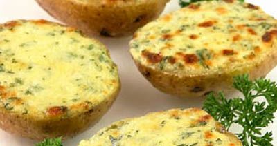 Целую головку чеснока, смазать маслом и завернуть в фольгу. Картофель "в мундире" и чеснок запечь на гриле до готовности. Запечённый чеснок мелко порубить. Каждую картофелину разрезать вдоль, вынуть ложкой сердцевину, смешать с чесночной массой. Добавить петрушку и сыр, оставив немного для посыпки, посолить, поперчить. Миксером взбить массу до однородной консистенции, влить сливки, перемешать. Наполнить картофель приготовленной начинкой, посыпать оставшимся сыром и запечь.