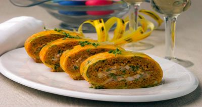 Выложите испечённый морковный корж, сверху распределите начинку, скатайте рулет, охладите и нарежьте на порции.