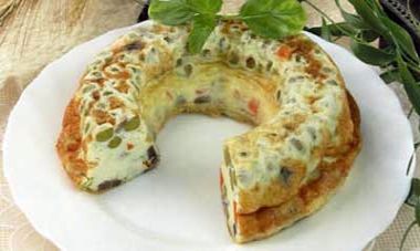 Грибы мелко порубить и обжарить на части масла. Морковь нарезать мелкими кубиками, смешать с грибами и горошком. Яйца взбить с молоком, посолить и поперчить. Соединить с овощами и грибами, перемешать. Кольцевую или сферическую форму смазать оставшимся маслом и посыпать мукой. В подготовленную форму выложить омлет, накрыть фольгой, запекать в духовке или варить на пару до загустения массы.