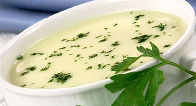 Цветную капусту разберите на соцветия. Картофель и лук нарежьте дольками, варите в горячей подсоленной воде до готовности. Затем добавьте капусту, доведите до кипения. Овощи вместе с отваром протрите. Муку подсушите без жира, разведите сливками и варите 5-7 минут. Полученный суп-пюре доведите до кипения, добавьте тёртый сыр, соус, соль, перец и варите ещё 5 минут.