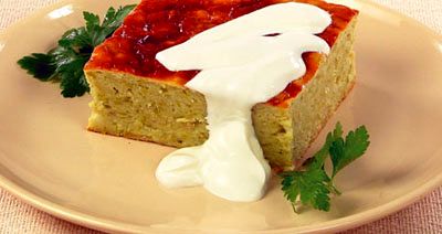 Готовую запеканку нарезать порционными кусками. При подаче полить сметаной.