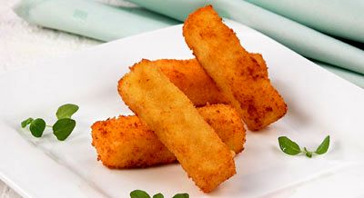 Сыр нарежьте брусочками с ребром 1 см. Сыр обмакните во взбитые яйца, запанируйте в сухарях и обжарьте на масле.