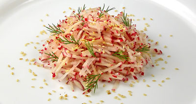 Редис натереть на терке, добавить уксус, сахар, светлый соевый соус и масло, накрыть посуду крышкой, встряхнуть и поставить в холодильник на ночь. При подаче салат выложить в салатник и посыпать жареными семенами кунжута.