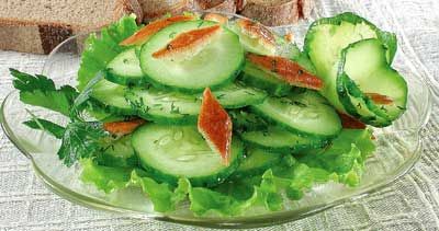 Зелёный салат уложите в салатник. Сверху добавьте свежие огурцы, нарезанные кружочками, а также корочки белого хлеба, натёртые чесноком и нарезанные в виде маленьких ромбиков.