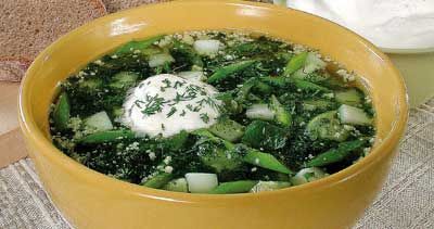 Щавель переберите, хорошо промойте в холодной воде, мелко нарежьте и проварите в 2 л воды не больше 5 минут. Охладите. Зеленый лук, огурцы и яичные белки мелко нарежьте, желтки разотрите. Всё перемешайте, посолите и положите в отвар со щавелем. Приправьте холодник сметаной, сахаром, посолите и посыпьте мелко нарезанной зеленью укропа.