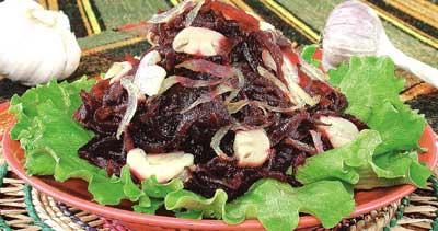 Свёклу сварите в кожуре, охладите и очистите, нарежьте соломкой и сбрызните уксусом. Грибы промойте, замочите в холодной воде на 3-4 часа, затем сварите в этой же воде до готовности. Одну луковицу мелко нарежьте и обжарьте в части растительного масла. Вторую луковицу и варёные грибы нарежьте соломкой. Чеснок истолките. Все ингредиенты салата перемешайте, заправьте оставшимся маслом, солью и сахаром по вкусу.