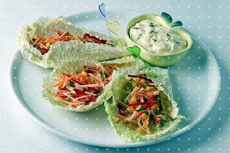 Овощи тщательно промойте. Капусту разберите на листья. У перца вырежьте плодоножку, выньте её вместе с семенами, промойте перец внутри под проточной водой. Разрежьте перец вдоль пополам и ножом удалите перегородки. Морковь очистите от кожицы, стараясь срезать её как можно тоньше, затем удалите корешок и верхнюю часть корнеплода. Нарежьте перец, морковь и яблоки соломкой. Из лимона отожмите сок, сбрызните им яблоки, чтобы они не потемнели. Зелень петрушки и укропа по отдельности мелко порубите. Укроп смешайте с майонезом, переложите в соусник. Овощи соедините, добавьте кукурузу, зелень петрушки. Выложите приготовленный салат на листья капусты, уложите их на блюдо, поставьте соусник с соусом.
