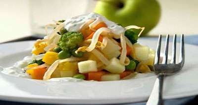 Овощную смесь отварите в небольшом количестве подсоленной воды. Картофель и яблоко нарежьте кубиками.
