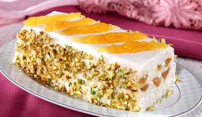 Ревень очистите, нарежьте кусочками. В 100 мл воды всыпьте 3 столовые ложки сахара, вскипятите, положите ревень, сварите до размягчения, протрите через сито и охладите. Творог перемешайте с оставшимся сахаром и ванильным сахаром. Сливки взбейте и смешайте их с творожной массой. В форму для кекса выложите слоями творожную массу и пюре из ревеня, оставив часть пюре для подачи, и поставьте в морозильную камеру на 4 часа. Выньте форму из морозильной камеры за 1 час до подачи и разморозьте в холодильнике. Опрокиньте парфе на блюдо, посыпьте со всех сторон фисташками и оформите оставшимся пюре.