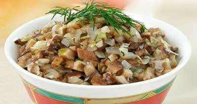 Лук очистите, нарежьте мелкими кубиками и обжарьте на масле. Грибы мелко порубите. Соедините грибы с луком и тушите 5-10 минут. За 2 минуты до окончания тушения добавьте толчёный чеснок, перец и соль.